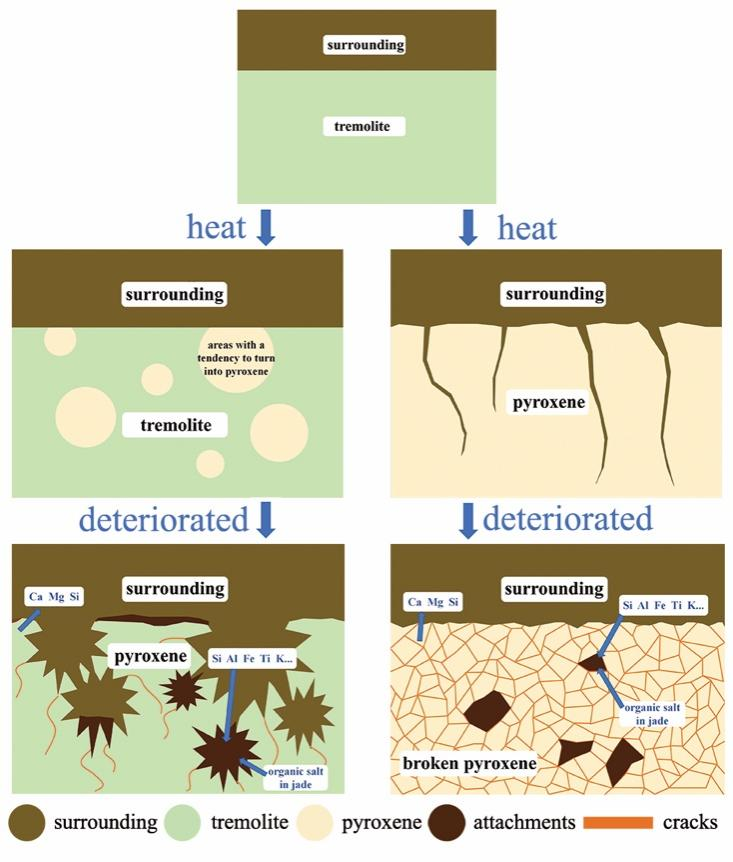本研究展示了商代三星堆遗址祭祀坑透闪石质玉石器劣化结构及劣化与受热间的关联,为玉石器保护修复提供了参考。