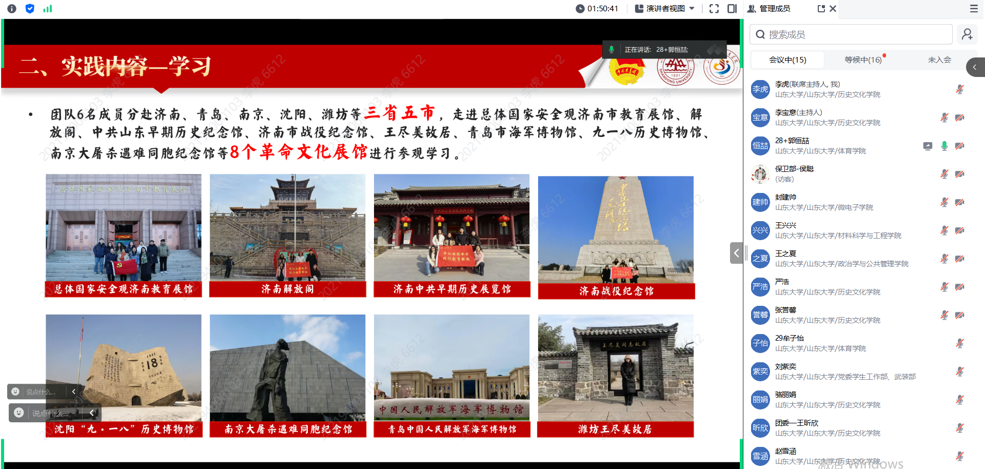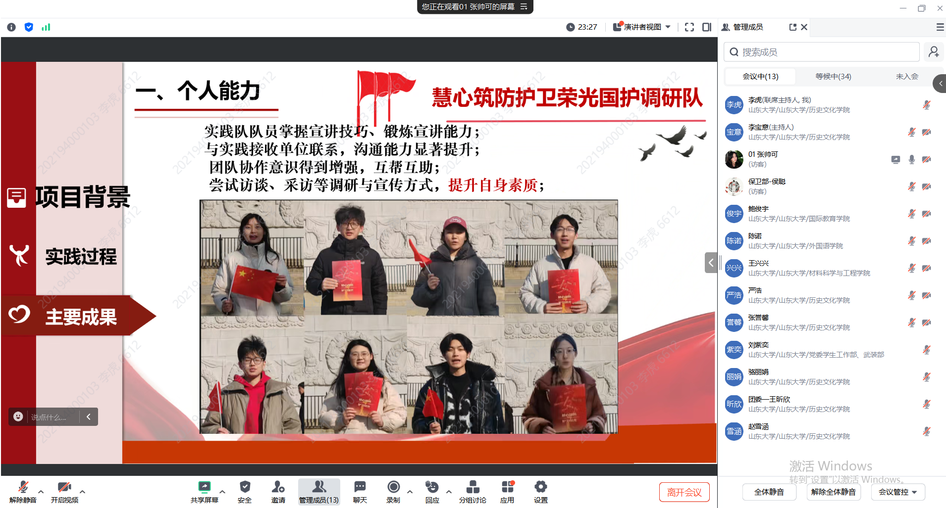 活动中,来自一校三地不同公司、专业的负责同学通过线上平台依次展示了实践过程、实践成果、实践展望等内容。他们完成问卷调查、开展访谈和走访调研,查阅海量资料、深入各地多个育人场馆、组织多形式宣讲,聚焦国家安全专题,深刻阐述国家安全的重要性,深入挖掘开展国家安全教育对当代老员工成长发展的重要意义。